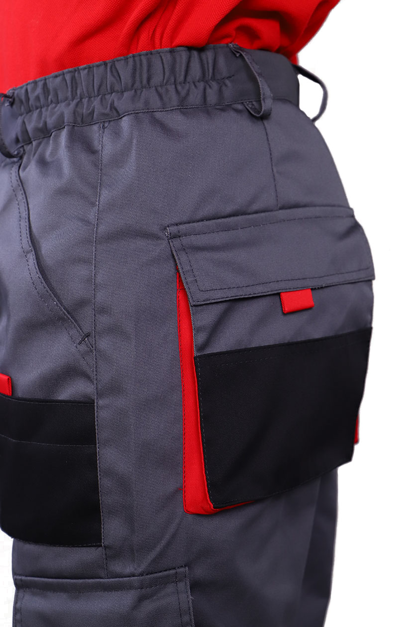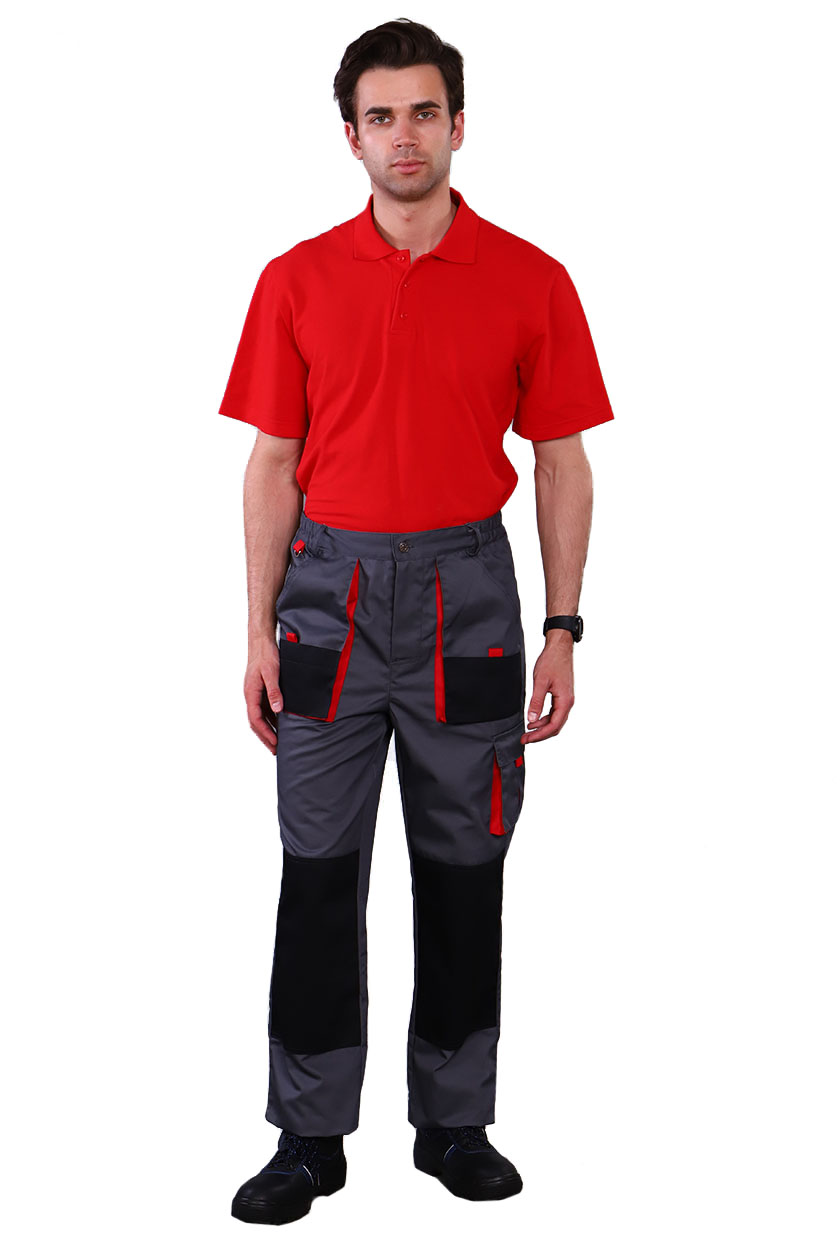 Брюки мужские с застежкой гульфика на тесьму «молния» и притачным поясом. Передние половинки брюк с двумя боковыми накладными объемными карманами с фигурным входом, с наколенниками. Наколенники со входом для амортизационных накладок.